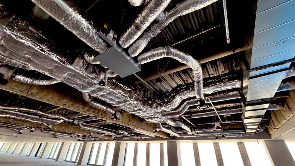天井高さ確保のため、 梁越えが多い中、冷媒ルート、ダクトルートの排煙窓をアルポリに変更し確保することで天高を守った