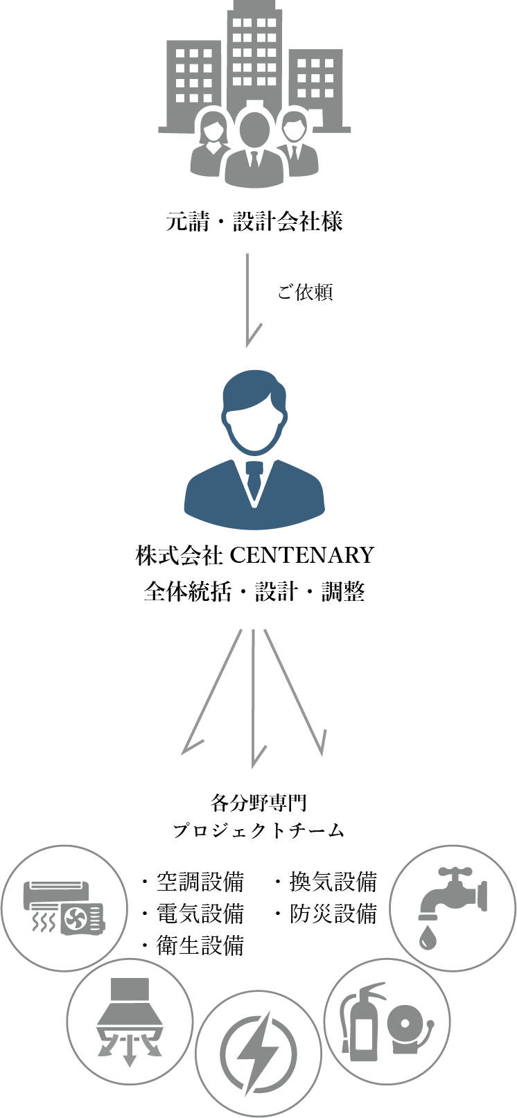 電気を軸に、空調・換気・衛生・防災の5分野を総合的に判断。プロジェクト全体最適を実現します