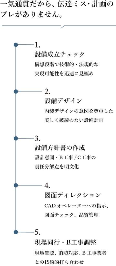 内装設計を主力とする設計事務所様にとって、煩雑な設備計画は大きな負担となりがちです。私たちは御社の「設備担当」としてチームに参画し、調整業務を代行。特に調整事項の多い大規模案件ほど、その負担軽減効果を実感いただけます。